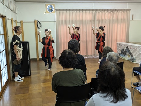 イベントは「おほほ倶楽部」よる銭太鼓、玉すだれなどのパフォーマンスで、残暑の厳しい中でしたが皆さんお楽しみのようでした。 |